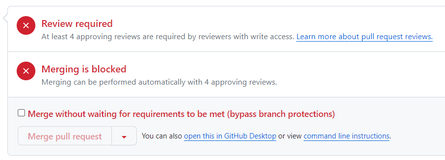 - 에러를 보니 write access를 가진 reviewers의 approve가 필요하다고 되어 있다.
