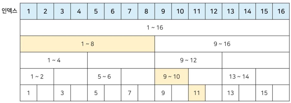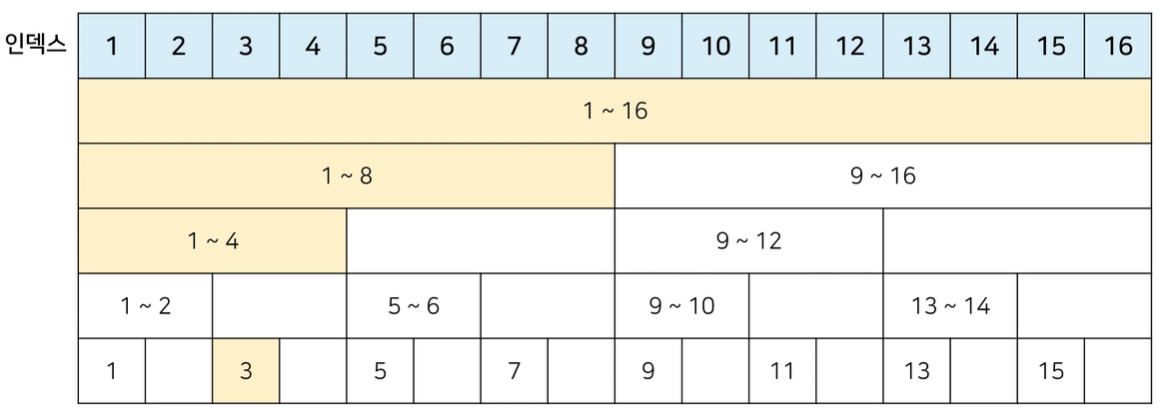 - 2진법 인덱스 구조를 활용하여 구간 합 문제를 효과적으로 해결해줄 수 있는 자료구조