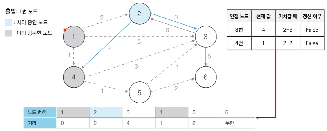 - [Step 3] 방문하지 않은 노드 중에서 최단 거리가 가장 짧은 노드인 2번 노드를 처리한다.