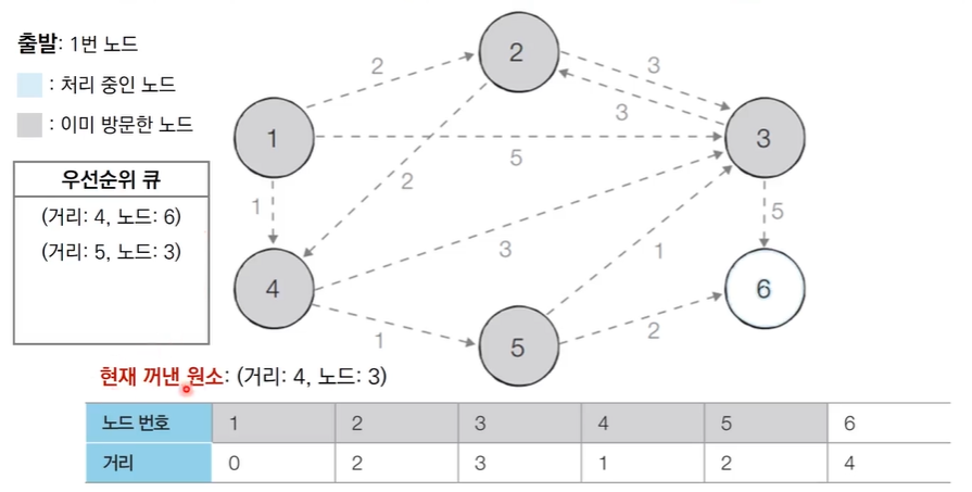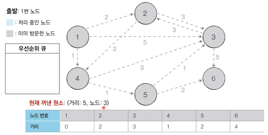 - [Step 5] 우선순위 큐에서 원소를 꺼낸다. 3번 노드는 아직 방문하지 않았으므로 이를 처리한다.