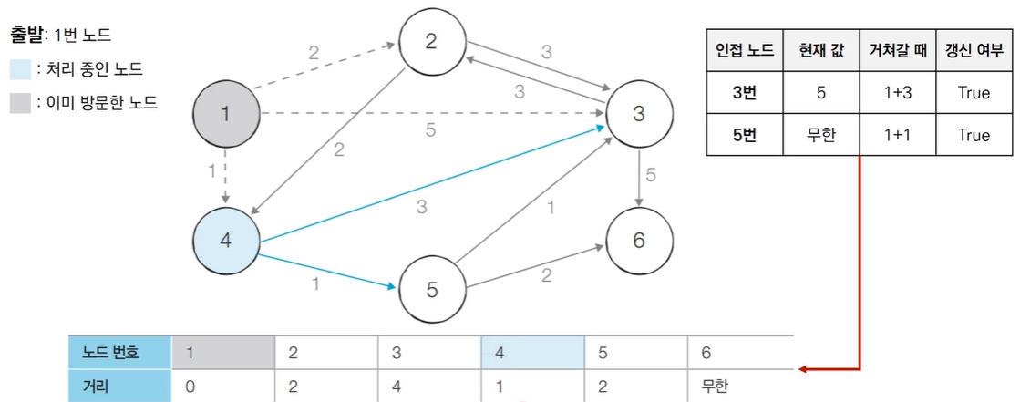 - [Step 2] 방문하지 않은 노드 중에서 최단 거리가 가장 짧은 노드인 4번 노드를 처리한다.