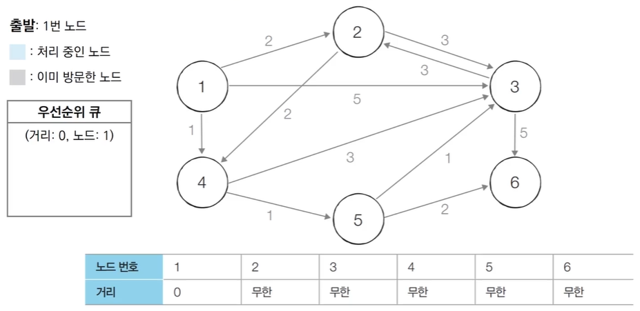 - [초기 상태] 그래프를 준비하고 출발 노드를 설정하여 우선순위 큐에 삽입한다.