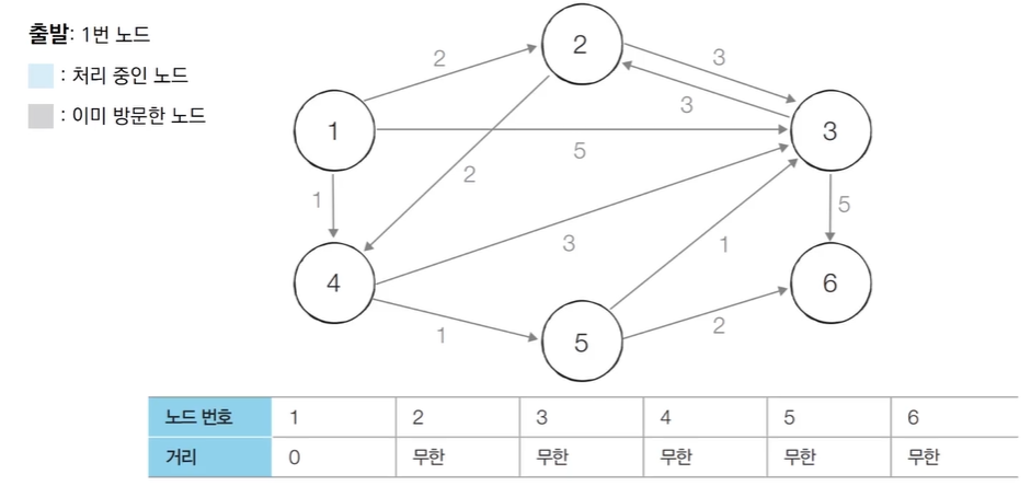 - [초기 상태] 그래프를 준비하고 출발 노드를 설정한다.