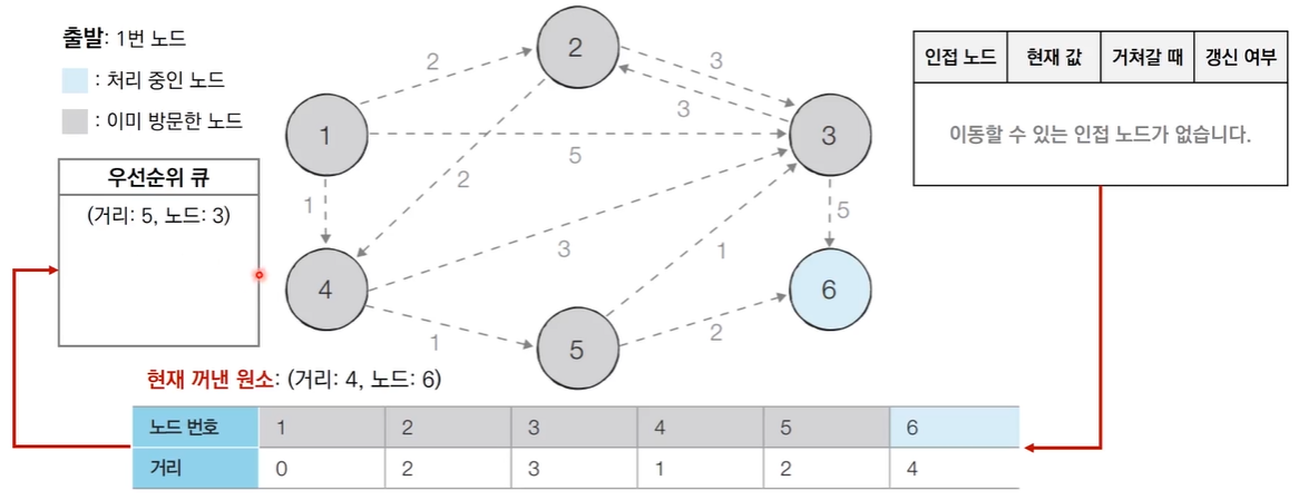 - [Step 7] 우선순위 큐에서 원소를 꺼낸다. 6번 노드는 아직 방문하지 않았으므로 이를 처리한다.