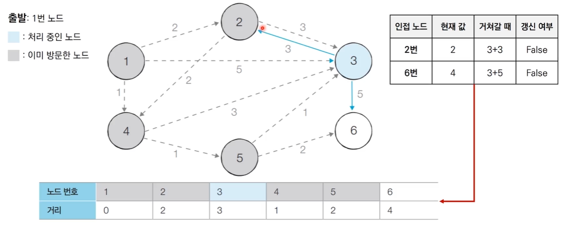 - [Step 5] 방문하지 않은 노드 중에서 최단 거리가 가장 짧은 노드인 3번 노드를 처리한다.