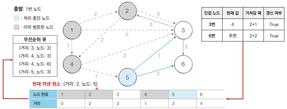 - [Step 4] 우선순위 큐에서 원소를 꺼낸다. 5번 노드는 아직 방문하지 않았으므로 이를 처리한다.