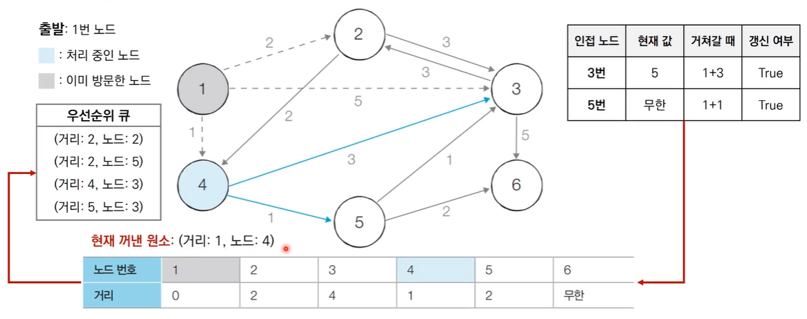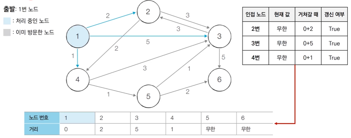 - 알고리즘 동작 과정에서 최단 거리 테이블은 각 노드에 대한 현재까지의 최단 거리 정보를 가지고 있다.