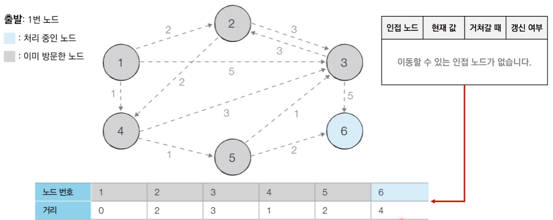 - [Step 6] 방문하지 않은 노드 중에서 최단 거리가 가장 짧은 노드인 6번 노드를 처리한다.