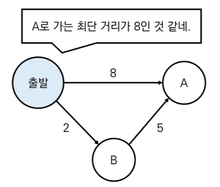 - 단계를 거치며 한 번 처리된 노드의 최단 거리는 고정되어 더 이상 바뀌지 않는다.
