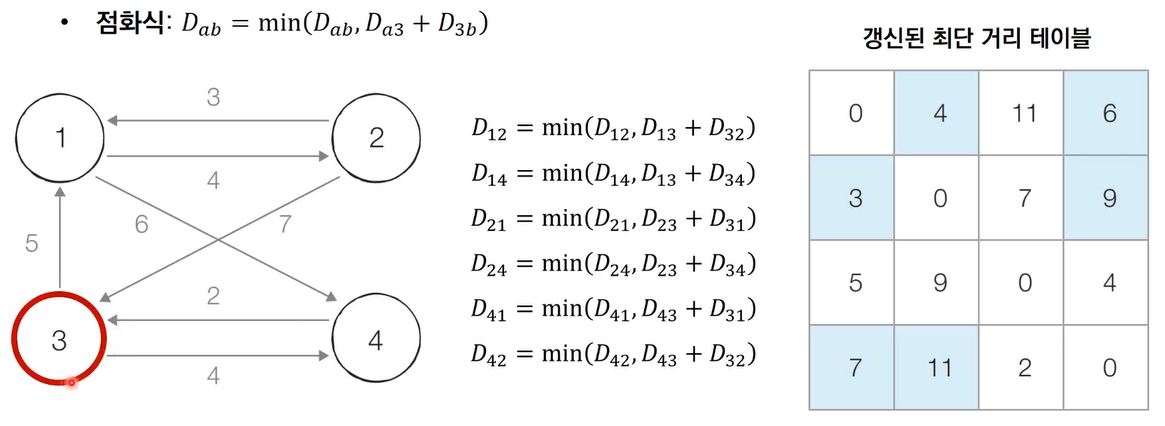 - [Step 3] 3번 노드를 거쳐 가는 경우를 고려하여 테이블을 갱신한다.