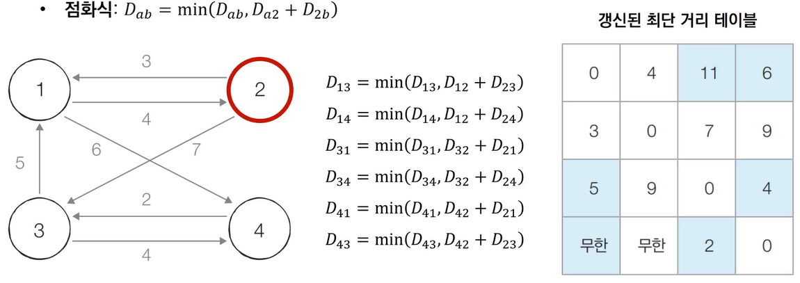 - [Step 2] 2번 노드를 거쳐 가는 경우를 고려하여 테이블을 갱신한다.