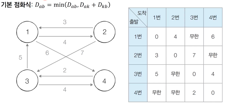 - 플로이드 워셜은 2차원 테이블에 최단 거리 정보를 저장한다.