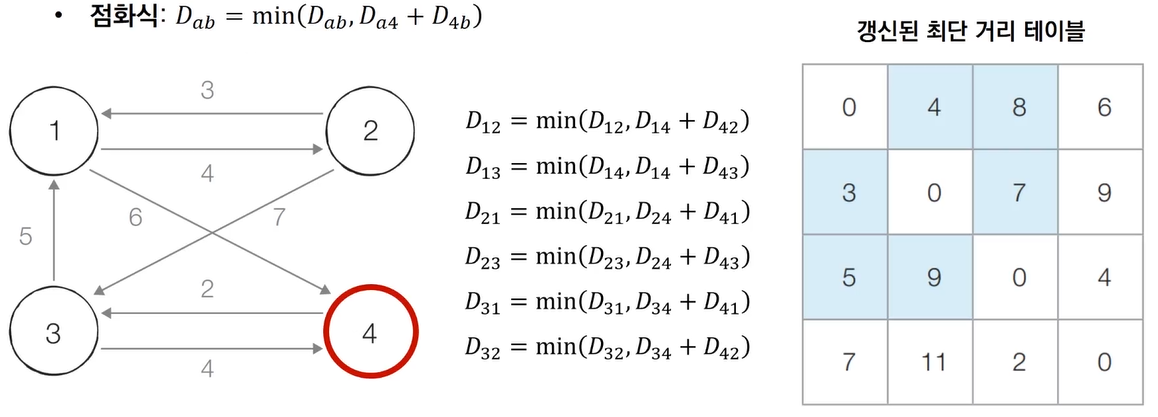 - [Step 4] 4번 노드를 거쳐 가는 경우를 고려하여 테이블을 갱신한다.