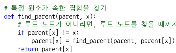 # 특정 원소가 속한 집합을 찾기 def find_parent(parent, x): # 루트 노드가 아니라면, 루트 노드를 찾을 때까지 재귀적으로 호출 if parent[x] != x: parent[x] = find_parent(parent, parent[x]) return parent[x] # 두 원소가 속한 집합을 합치기 def union_parent(parent, a, b): a = find_parent(parent, a) b = find_parent(parent, b) if a < b: parent[b] = a else: parent[a] = b # 노드의 개수와 간선(Union 연산)의 개수 입력 받기 v, e = map(int, input().split()) parent = [0] * (v + 1) # 부모 테이블 초기화하기 # 부모 테이블상에서, 부모를 자기 자신으로 초기화 for i in range(1, v + 1): parent[i] = i # Union 연산을 각각 수행 for i in range(e): a, b = map(int, input().split()) union_parent(parent, a, b) # 각 원소가 속한 집합 출력하기 print('각 원소가 속한 집합: ', end='') for i in range(1, v + 1): print(find_parent(parent, i), end=' ') print() # 부모 테이블 내용 출력하기 print('부모 테이블: ', end='') for i in range(1, v + 1): print(parent[i], end=' ') - 경로 압축 소스코드 (Java)