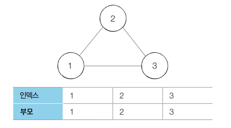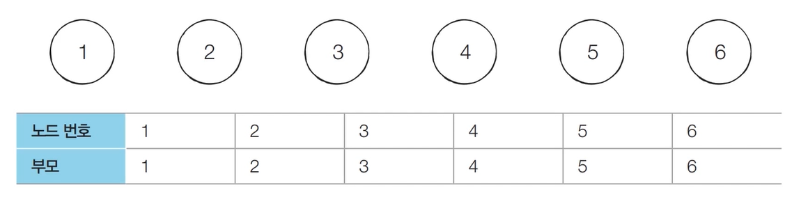 - [초기 단계] 모든 노드에 대하여 자기 자신을 부모로 설정하는 형태로 부모 테이블을 초기화한다.