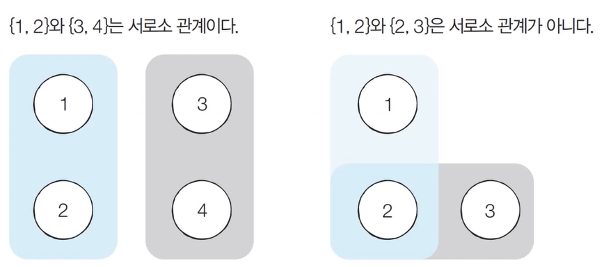 - 서로소 집합(Disjoint Sets)란 공통 원소가 없는 두 집합