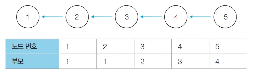 - 기본적인 형태의 서로소 집합 자료구조에서는 루트 노드에 즉시 접근할 수 없다.