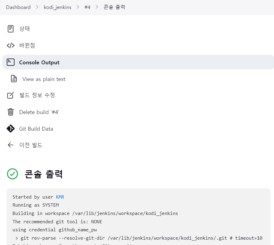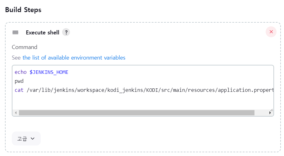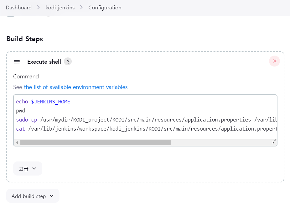 echo $JENKINS_HOME pwd cat /var/lib/jenkins/workspace/kodi_jenkins/KODI/src/main/resources/application.properties - 이대로 지금 빌드하면 실패