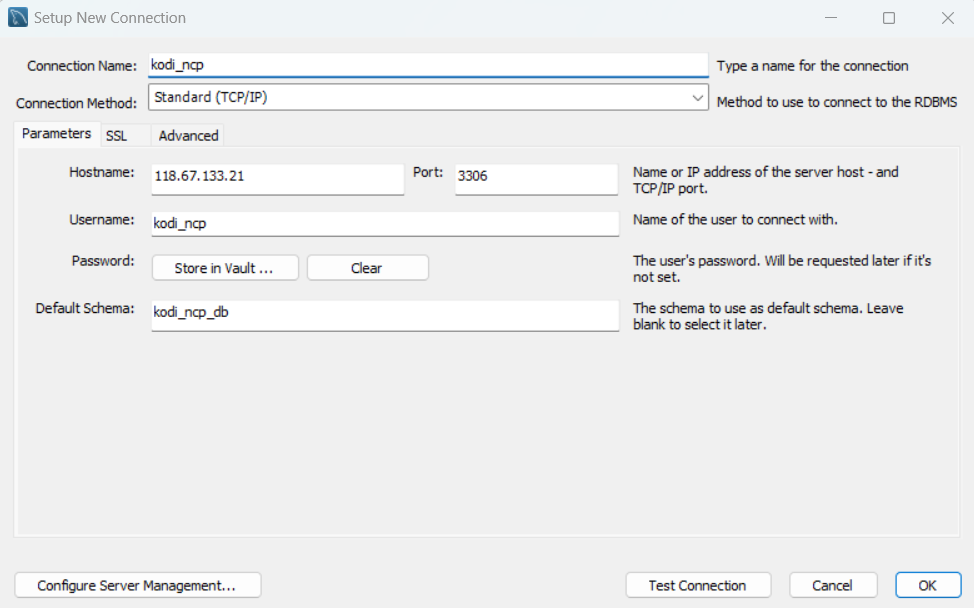 - 호스트 이름에 서버 접속용 공인 IP, 포트번호 입력