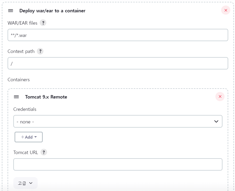 - kodi_jenkins - Configuration - 빌드 후 조치 추가 - Deploy war/ear to a container