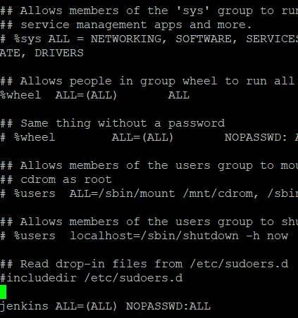 - jenkins ALL=(ALL) NOPASSWD:ALL
