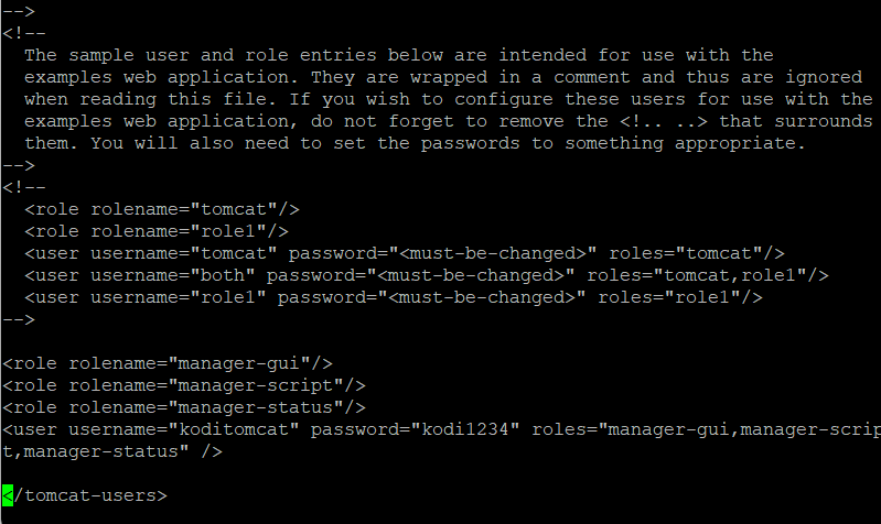 - vi $TOMCAT_HOME/conf/tomcat-users.xml