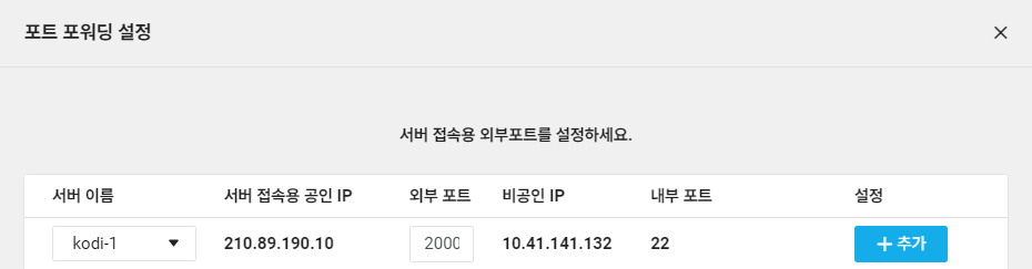 - 만일 서버 접속용 공인 IP가 2000번 포트라고 할 때 자동으로 비공인 IP인 22번 포트로 연결