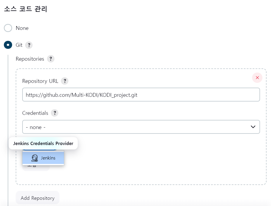 - Repository URL 입력 - Jenkins 선택
