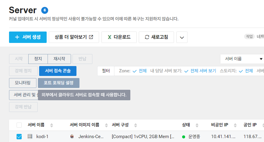 - NCP server를 기본 비공인 IP 22포트로 접속