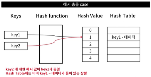 - 서로 다른 키의 해시 함수를 통한 해시 값이 동일한 경우