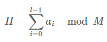 해시 값을 계산하기 위해서 우리는 문자열 혹은 수열을 하나의 정수로 치환하려고 한다. 간단하게는 수열의 값을 모두 더할 수도 있다. 해시 함수의 정의에서 유한한 범위의 출력을 가져야 한다고 했으니까 적당히 큰 수 M으로 나눠주자. 짜잔! 해시 함수가 완성되었다. 이를 수식으로 표현하면 아래와 같다.