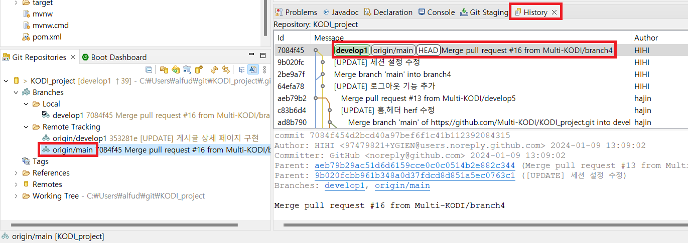 [Github/sts4] 팀프로젝트 개인 작업 중간에 main에 바뀐 코드 pull하기 1. pull 2. merge 방법 1 - 바로 merge 방법 2 - History에서 merge할 원격 Repository와 메시지 선택 3. 특정 커밋한 내용만 pull하고 싶으면 해당 메시지 선택하고 Cherry-Pick 선택 4. main 내용 로컬로 가져온거 확인 Git, Github 2024.01.09